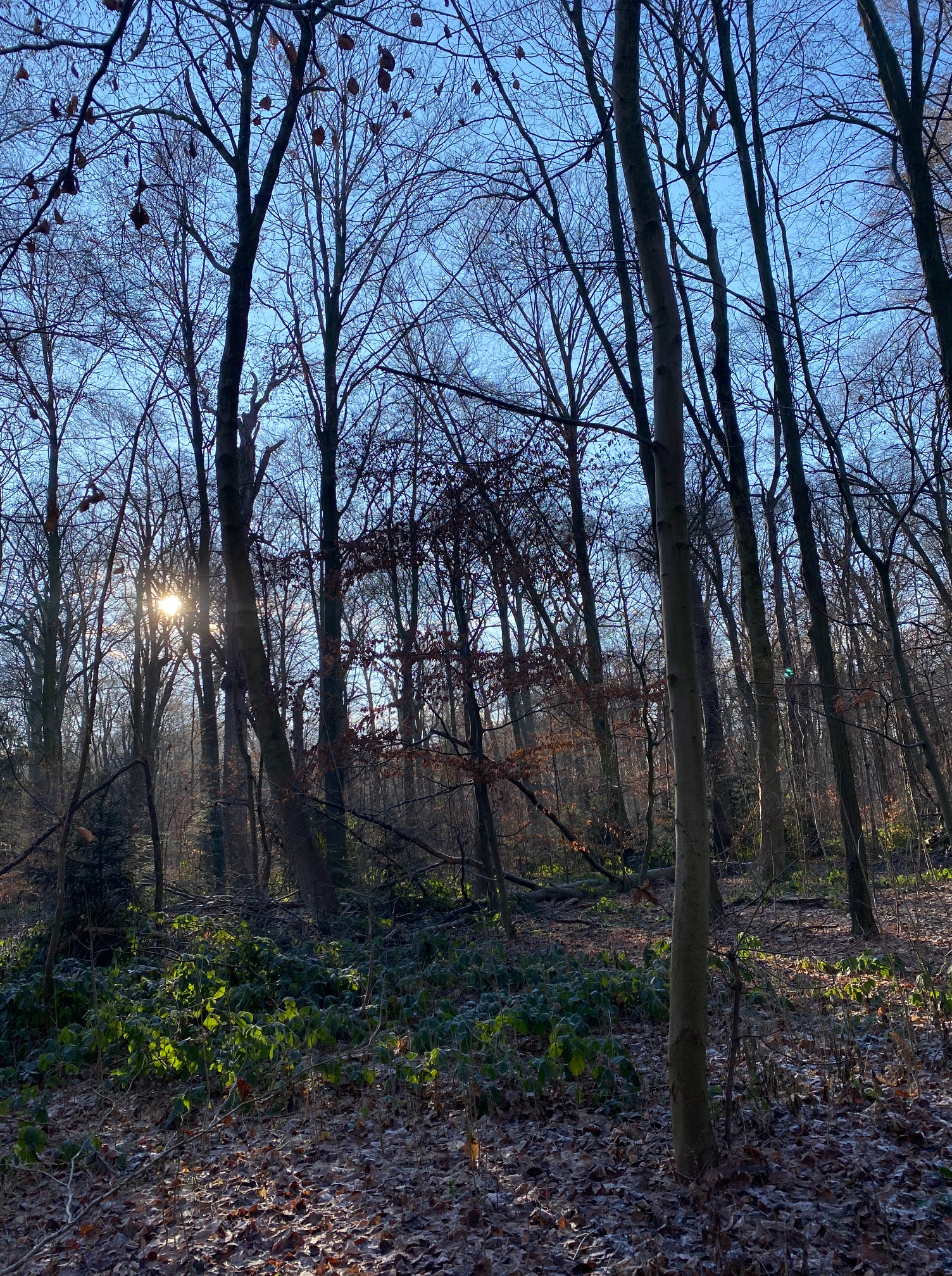 I wondered about the song. I wondered how it translates into German and if Näse has a rhyming partner the way ‘nose’ rhymes with ‘glows.’ I thought about the exchange I’d heard between the man and his youngest, the German words I’d picked out with much more ease than I would have the previous Boxing Day. While I wondered, Malarkey wandered as far as the lead would allow him, paws crunching on the white frost that periodically iced the soft carpet of dead leaves. The path was empty, the air cold and clear, and the forest under the periwinkle sky a lot less brown than it had appeared at first glance. Mottled shades of orange mixed in with the purply-brown leaves underfoot. Yellowy-green algae climbed the bark of nearby tree trunks, and bright green moss gathered near roots here and there.
